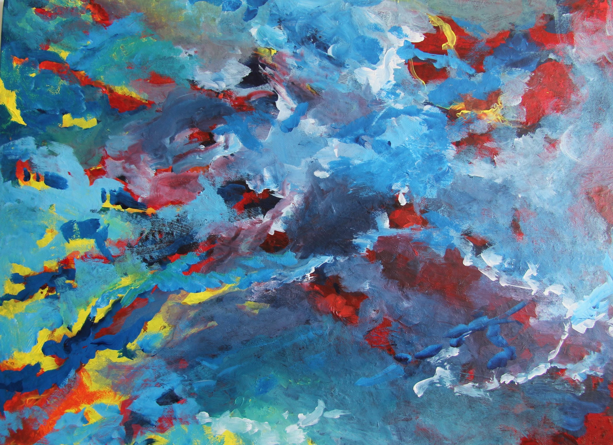 The picture is flooded with distinct blue tones in different shades, yellow and red colors merge with blue and create unique transitions. These color combinations create a sense of movement and energy. Strokes of white color make the image even more interesting and emphasize the movement. Abstraction gives you the experiences of the image are completely subjective. Some might see vibrancy and energy, while others might experience peace and tranquility.