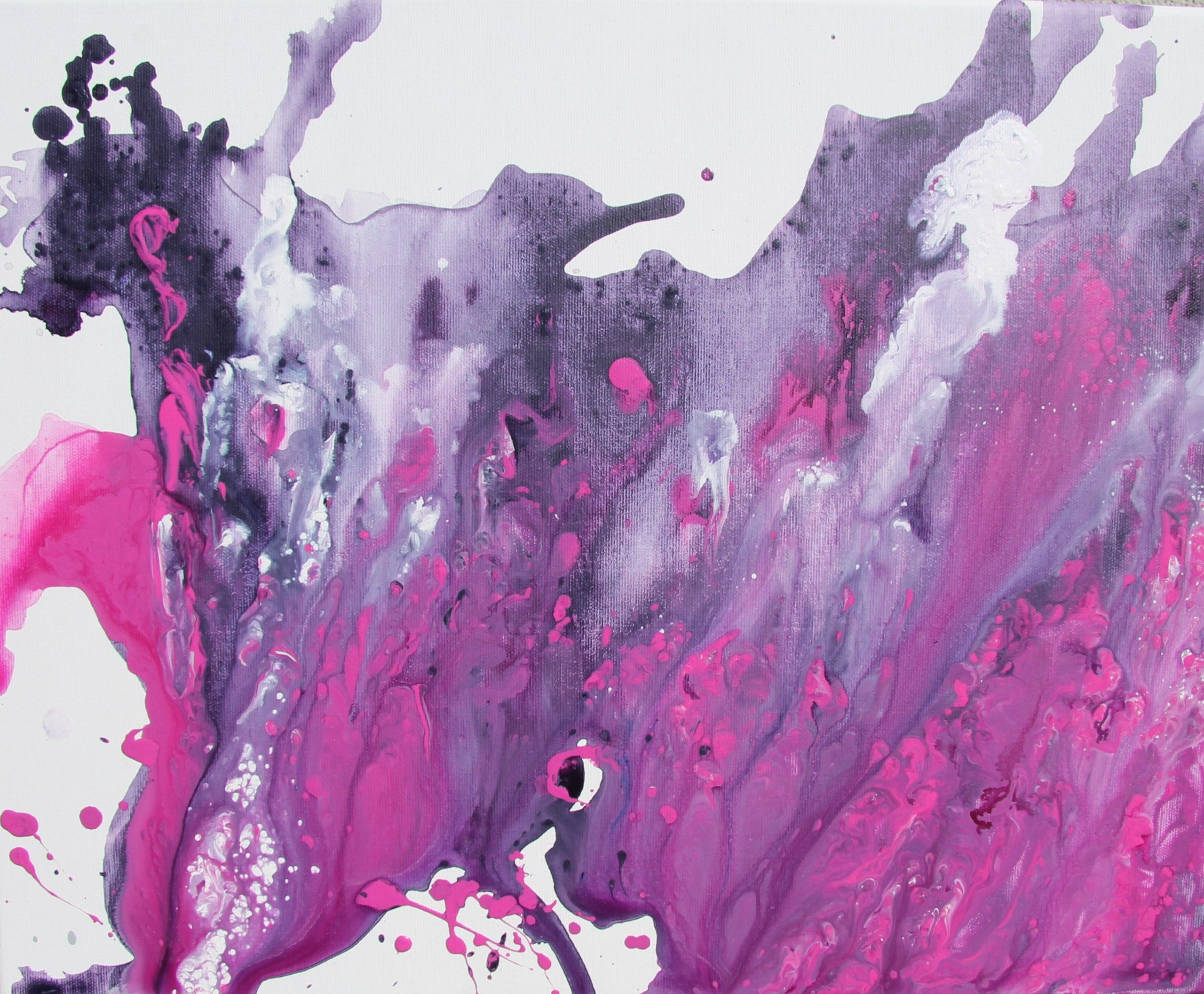 An abstract painting of acrylic on canvas using the pouring technique shows a spill of purple, pink and white colors that is dynamic and attractive. You can see multiple shades of purple and pink blending together while white highlights them. Different color tones flow into each other, and white breaks through them, creating bright spots in the picture. The image looks like the colors are dancing creating a beautiful abstract landscape.