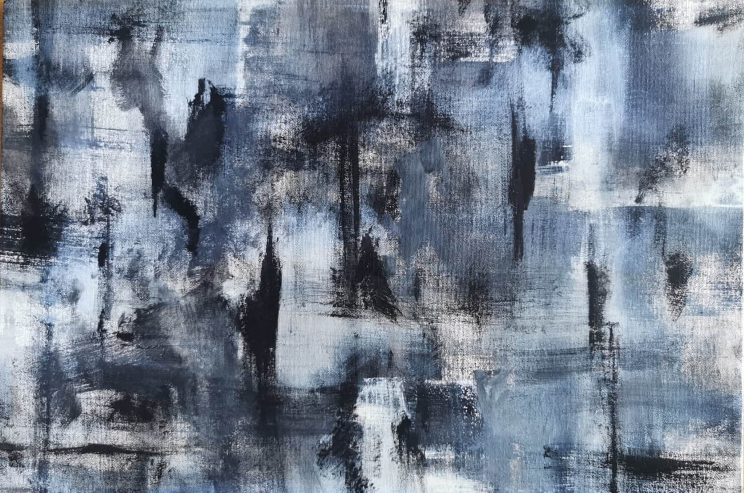 This hand painted one of a kind abstract acrylic painting covers the whole canvas with a mysterious, abstract aura. Each line has been meticulously painted with a subtly balanced combination of dark and light tones of black, grey and light blue to create an intriguing masterpiece. White speckles brighten the piece, while still blending seamlessly with the other darker colors. Bring a unique and artistic charm into any room with this captivating abstract piece. Notice how the shapes and lines compliment each other while allowing you to unwind and relax. The whole painting brings a calm, mysterious feeling. Unlock a mysterious world with this one of a kind painting!