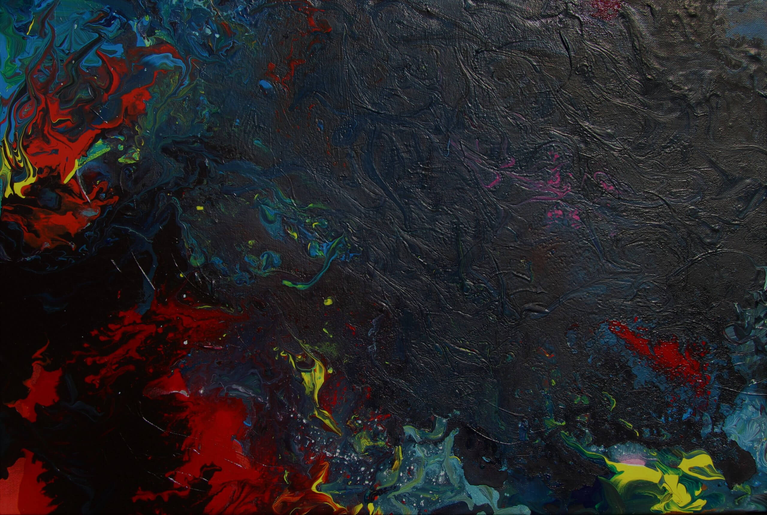 An abstract painting with a dark background and strokes of vibrant colors creates a dramatic and contrasting visual impression. Dark tones give a sense of mystery and depth, while red and yellow tones create dynamism, while blue shades soften the transition. This color combination creates a distinct contrast and creates a sense of movement and color explosion against the dark background. The painting relies on colors and strokes to create a strong subjective impression on the viewer.